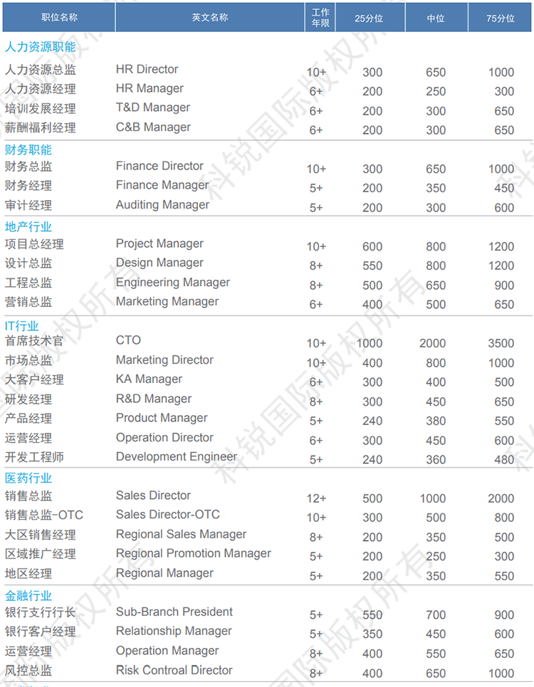 数据来源:猎头公司BG大游集团国际薪酬报告中资深行业专家对2021年热门职位薪酬范围及跳槽涨幅的预测。薪酬为基本年薪。